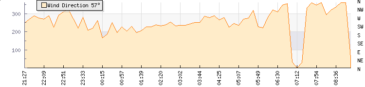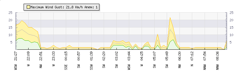 In the last few minutes the wind was South Westerly at an average speed of 1 kmh, reaching up to 2 kmh and a low of 0 kmh. The gust strength is2 kmh above the minimum speed |