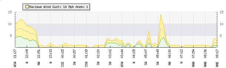 In the last few minutes the wind was Westerly at an average speed of 4 mph, reaching up to 7 mph and a low of 2 mph. The gust strength is5 mph above the minimum speed |