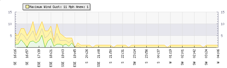 In the last few minutes the wind was South South West at an average speed of 1 mph, reaching up to 1 mph and a low of 0 mph. The gust strength is1 mph above the minimum speed |