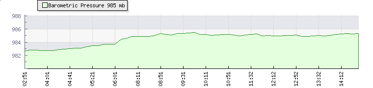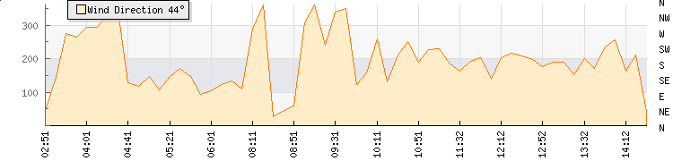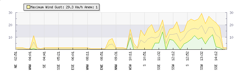 In the last few minutes the wind was Southerly at an average speed of 17 kmh, reaching up to 23 kmh and a low of 11 kmh. The gust strength is12 kmh above the minimum speed |