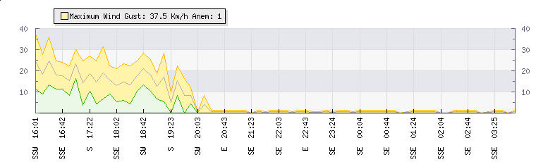In the last few minutes the wind was South Easterly at an average speed of 1 kmh, reaching up to 2 kmh and a low of 0 kmh. The gust strength is2 kmh above the minimum speed |