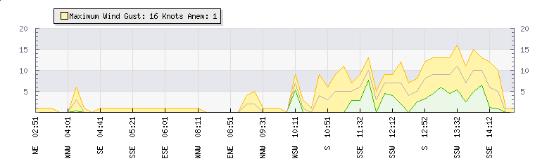 In the last few minutes the wind was Southerly at an average speed of 9 knots, reaching up to 13 knots and a low of 6 knots. The gust strength is7 knots above the minimum speed |