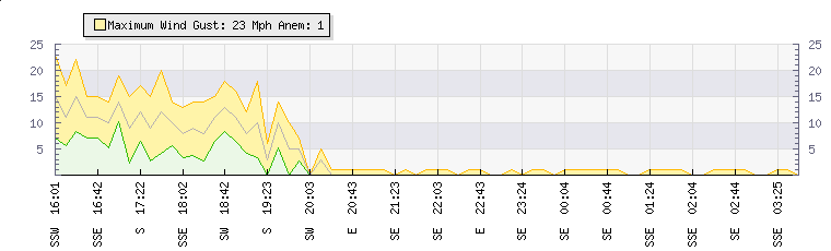 In the last few minutes the wind was South Easterly at an average speed of 1 mph, reaching up to 1 mph and a low of 0 mph. The gust strength is1 mph above the minimum speed |