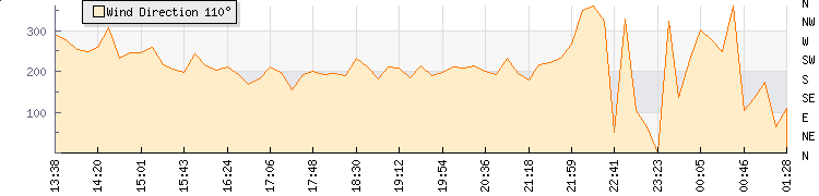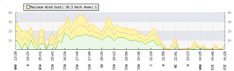 In the last few minutes the wind was North North East at an average speed of 1 kmh, reaching up to 2 kmh and a low of 0 kmh. The gust strength is2 kmh above the minimum speed |