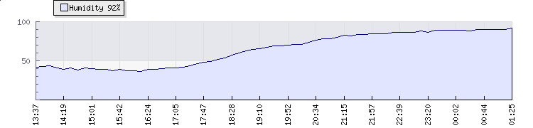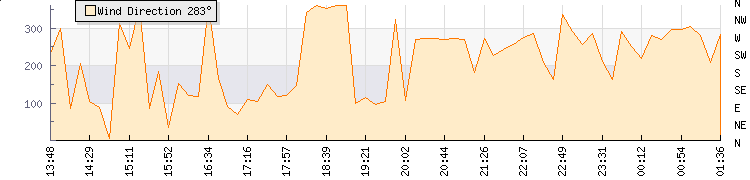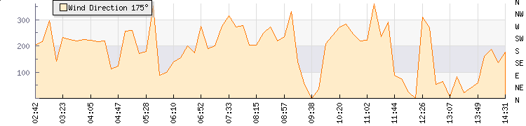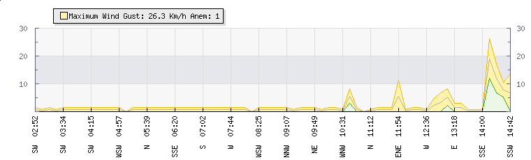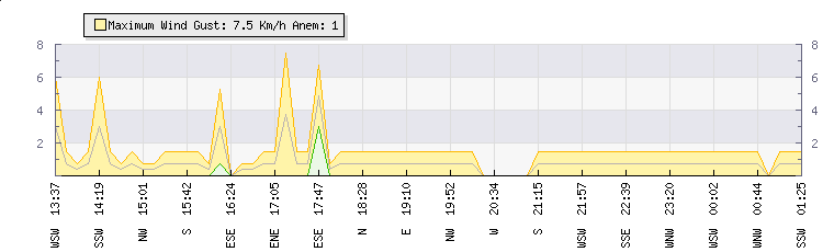 In the last few minutes the wind was Northerly at an average speed of 5 kmh, reaching up to 8 kmh and a low of 2 kmh. The gust strength is6 kmh above the minimum speed |