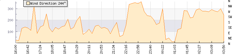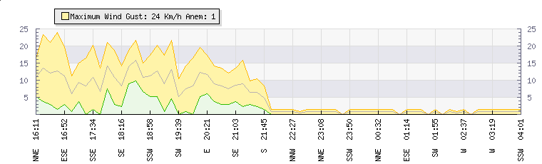 In the last few minutes the wind was West North West at an average speed of 1 kmh, reaching up to 1 kmh and a low of 0 kmh. The gust strength is1 kmh above the minimum speed |