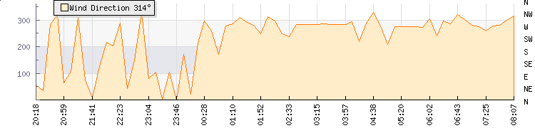 In the last few minutes the wind was West North West at an average speed of 1 knots, reaching up to 1 knots and a low of 0 knots. The gust strength is1 knots above the minimum speed |