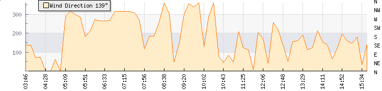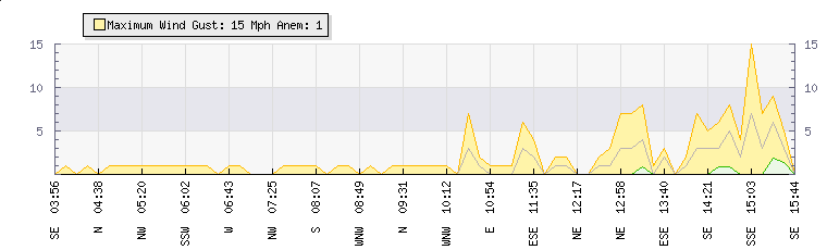 In the last few minutes the wind was South South East at an average speed of 3 mph, reaching up to 7 mph and a low of 0 mph. The gust strength is7 mph above the minimum speed |