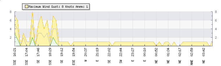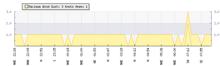 In the last few minutes the wind was North Easterly at an average speed of 1 knots, reaching up to 1 knots and a low of 0 knots. The gust strength is1 knots above the minimum speed |