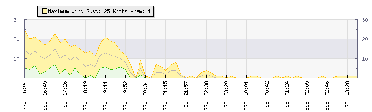In the last few minutes the wind was East South East at an average speed of 0 knots, reaching up to 0 knots and a low of 0 knots. The gust strength is0 knots above the minimum speed |