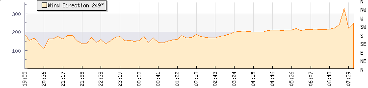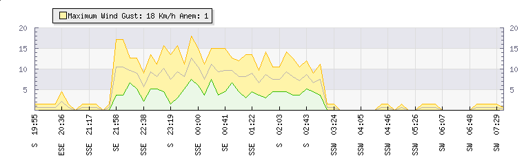 In the last few minutes the wind was South South West at an average speed of 0 kmh, reaching up to 0 kmh and a low of 0 kmh. The gust strength is0 kmh above the minimum speed |