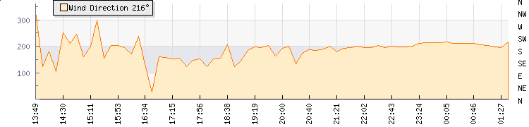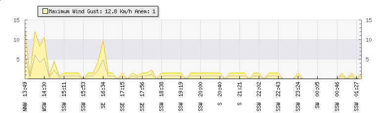 In the last few minutes the wind was South South East at an average speed of 1 kmh, reaching up to 1 kmh and a low of 0 kmh. The gust strength is1 kmh above the minimum speed |