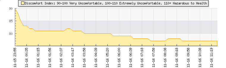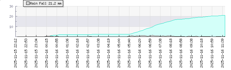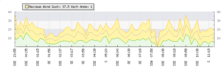 In the last few minutes the wind was South South East at an average speed of 25 kmh, reaching up to 36 kmh and a low of 14 kmh. The gust strength is22 kmh above the minimum speed |