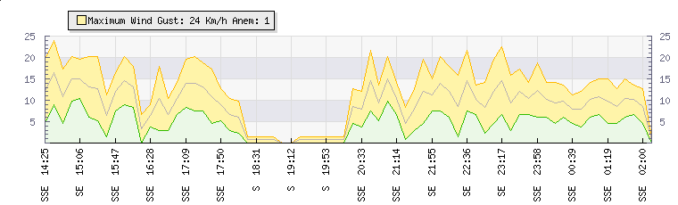 In the last few minutes the wind was South South East at an average speed of 13 kmh, reaching up to 19 kmh and a low of 8 kmh. The gust strength is11 kmh above the minimum speed |
