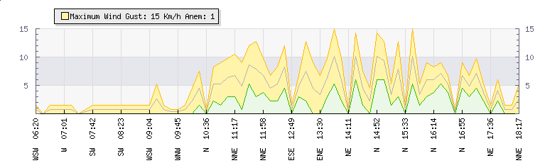 In the last few minutes the wind was North North East at an average speed of 1 kmh, reaching up to 1 kmh and a low of 0 kmh. The gust strength is1 kmh above the minimum speed |