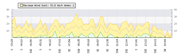 In the last few minutes the wind was South South East at an average speed of 10 kmh, reaching up to 18 kmh and a low of 2 kmh. The gust strength is16 kmh above the minimum speed |