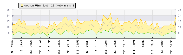 In the last few minutes the wind was Southerly at an average speed of 12 knots, reaching up to 17 knots and a low of 7 knots. The gust strength is10 knots above the minimum speed |