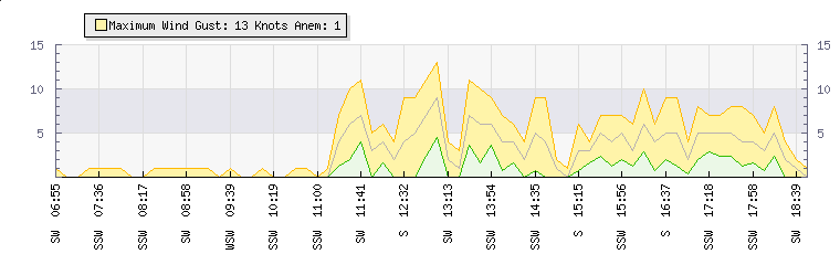 In the last few minutes the wind was South South West at an average speed of 2 knots, reaching up to 4 knots and a low of 0 knots. The gust strength is4 knots above the minimum speed |