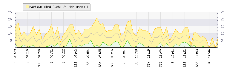 In the last few minutes the wind was South South East at an average speed of 6 mph, reaching up to 11 mph and a low of 1 mph. The gust strength is10 mph above the minimum speed |