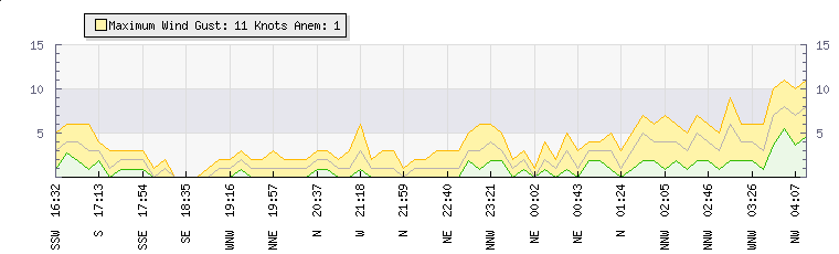 In the last few minutes the wind was North North East at an average speed of 1 knots, reaching up to 2 knots and a low of 0 knots. The gust strength is2 knots above the minimum speed |