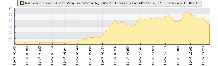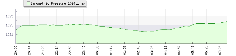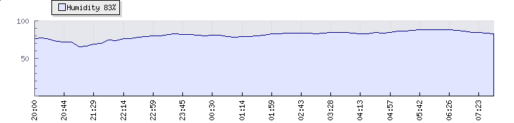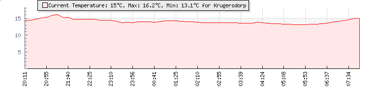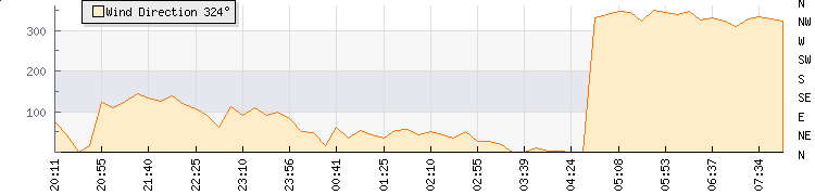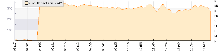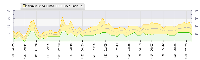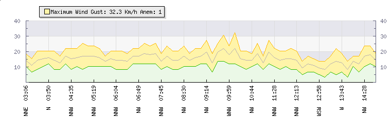 | Wind Gust: | 20 km/h | Min Temp: | 14.2 °C | Max Temp: | 15.9 °C | | Wind Average: | 14 km/h | Min Hum: | 87 % | Max Hum: | 90 % | |  |