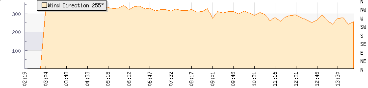 In the last few minutes the wind was West South West at an average speed of 0 kmh, reaching up to 0 kmh and a low of 0 kmh. The gust strength is0 kmh above the minimum speed |