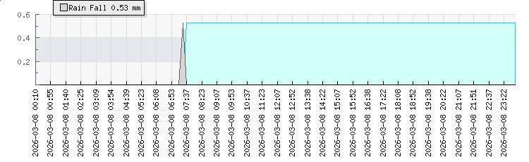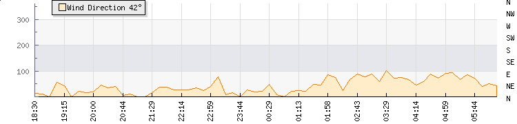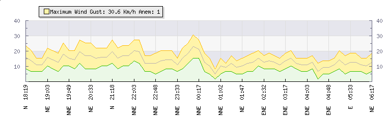 | Wind Gust: | 46 km/h | Min Temp: | 13.3 °C | Max Temp: | 22.9 °C | | Wind Average: | 32 km/h | Min Hum: | 55 % | Max Hum: | 87 % | |  |