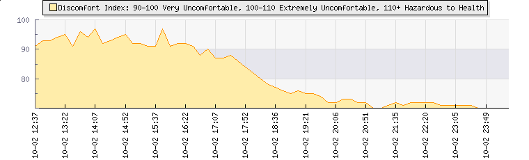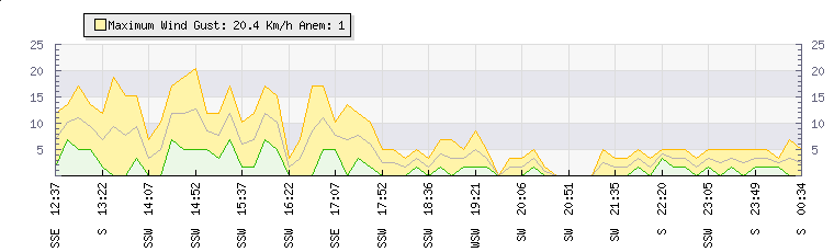 Wind Gust: | 20 km/h | Min Temp: | 11.1 °C | Max Temp: | 31.4 °C | Wind Average: | 13 km/h | Min Hum: | 31 % | Max Hum: | 74 % | |  |