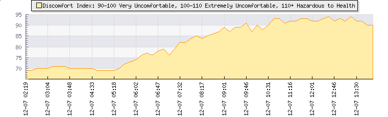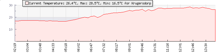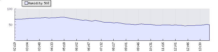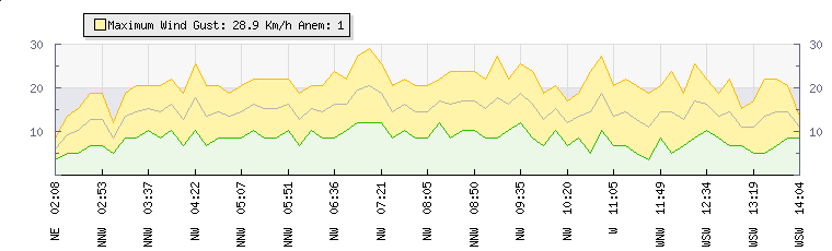 | Wind Gust: | 20 km/h | Min Temp: | 14.4 °C | Max Temp: | 30.2 °C | | Wind Average: | 10 km/h | Min Hum: | 48 % | Max Hum: | 90 % | |  |