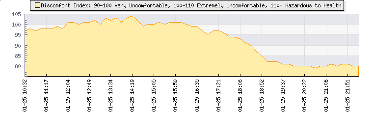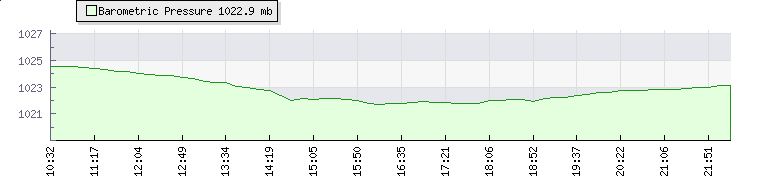 | Wind Speed: | 0|0|0 kmh | Wind Direction: | W 276° | Temperature: | 21.3°C | | Wet Bulb: | 16.2°C | Discomfort: | 79 | Humidity: | 60% | | Rainfall Today: | 0mm | 12 hrs Rainfall: | 0mm | 24 hrs Rainfall: | 0mm | | Barometer: | 1022.6mb | Dew Point: | 13.3°C | Clouds AGL: | 3236ft (986 m) | | Density-Alt: | 7382ft (2250 m) | Fire Danger: | | Webcam: |  |