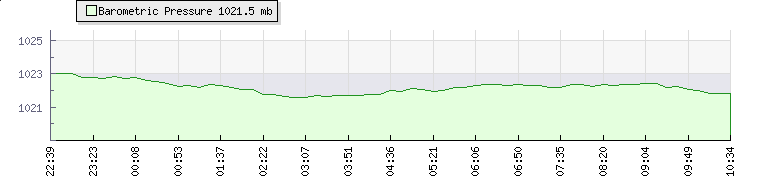 | Wind Speed: | 9|17|26 kmh | Wind Direction: | WNW 285° | Temperature: | 21.9°C | | Wet Bulb: | 17.4°C | Discomfort: | 82 | Humidity: | 65% | | Rainfall Today: | 0mm | 12 hrs Rainfall: | 0mm | 24 hrs Rainfall: | 0mm | | Barometer: | 1022mb | Dew Point: | 15°C | Clouds AGL: | 2753ft (839 m) | | Density-Alt: | 7490ft (2283 m) | Fire Danger: | | Webcam: |  |
