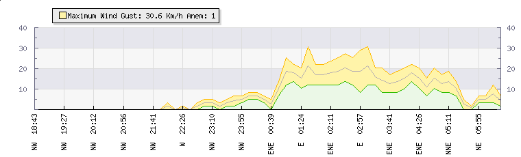 Wind Gust: | 29 km/h | Min Temp: | 11.8 °C | Max Temp: | 17.2 °C | Wind Average: | 20 km/h | Min Hum: | 77 % | Max Hum: | 93 % | |  |