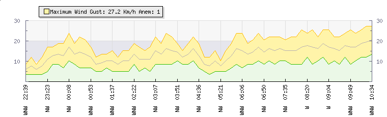 | Wind Gust: | 26 km/h | Min Temp: | 14.3 °C | Max Temp: | 22.2 °C | | Wind Average: | 18 km/h | Min Hum: | 65 % | Max Hum: | 91 % | |  |