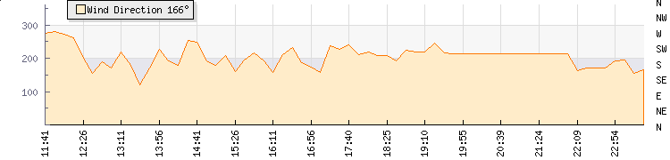 In the last few minutes the wind was South South East at an average speed of 2 kmh, reaching up to 3 kmh and a low of 0 kmh. The gust strength is3 kmh above the minimum speed |