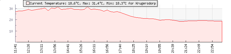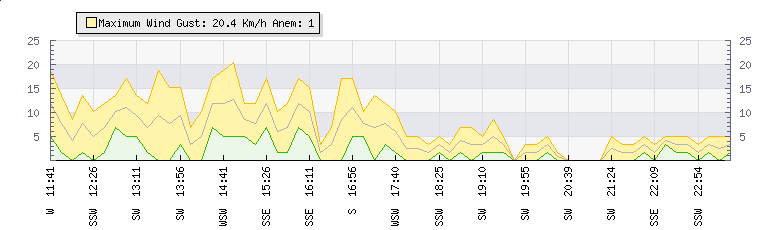Wind Gust: | 20 km/h | Min Temp: | 11.1 °C | Max Temp: | 31.4 °C | Wind Average: | 13 km/h | Min Hum: | 31 % | Max Hum: | 74 % | |  |