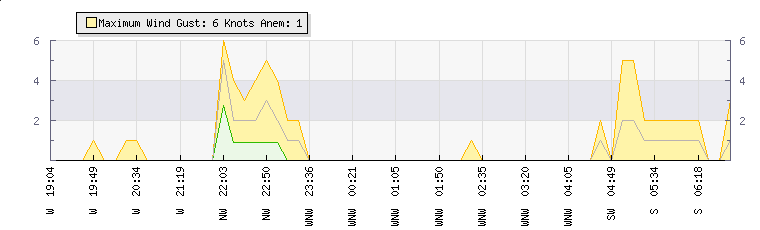 | Wind Gust: | 5 knots | Min Temp: | 12.4 °C | Max Temp: | 15.6 °C | | Wind Average: | 2 knots | Min Hum: | 70 % | Max Hum: | 79 % | |  |