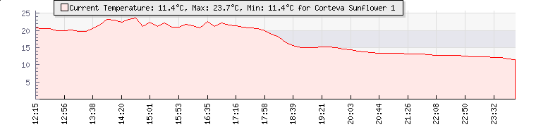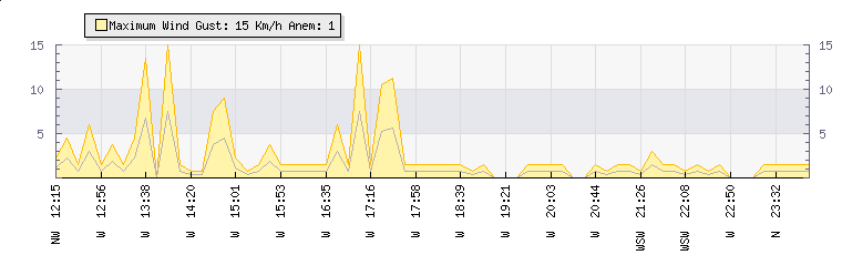 | Wind Gust: | 15 km/h | Min Temp: | 8.7 °C | Max Temp: | 23.7 °C | | Wind Average: | 8 km/h | Min Hum: | 66 % | Max Hum: | 95 % | |  |
