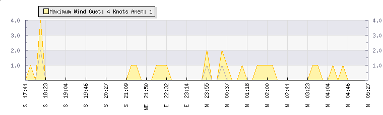 | Wind Gust: | 2 knots | Min Temp: | 14.4 °C | Max Temp: | 17.3 °C | | Wind Average: | 1 knots | Min Hum: | 68 % | Max Hum: | 83 % | |  |