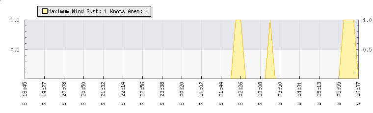 In the last few minutes the wind was Westerly at an average speed of 0 knots, reaching up to 0 knots and a low of 0 knots. The gust strength is0 knots above the minimum speed |