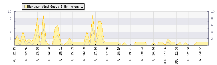 | Wind Gust: | 9 mph | Min Temp: | 8.7 °C | Max Temp: | 23.7 °C | | Wind Average: | 5 mph | Min Hum: | 66 % | Max Hum: | 95 % | |  |