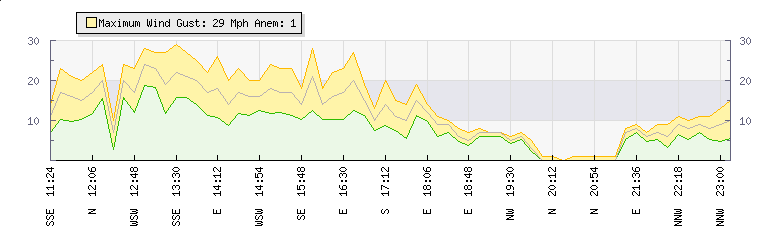 In the last few minutes the wind was Easterly at an average speed of 7 mph, reaching up to 8 mph and a low of 6 mph. The gust strength is2 mph above the minimum speed |