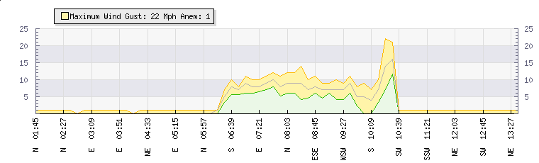 In the last few minutes the wind was West North West at an average speed of 1 mph, reaching up to 1 mph and a low of 0 mph. The gust strength is1 mph above the minimum speed |