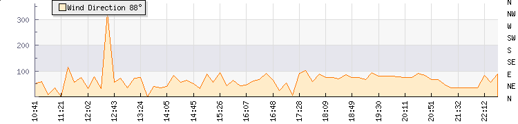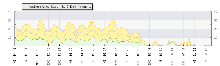 In the last few minutes the wind was East North East at an average speed of 4 kmh, reaching up to 5 kmh and a low of 2 kmh. The gust strength is3 kmh above the minimum speed |