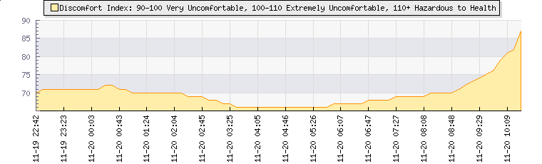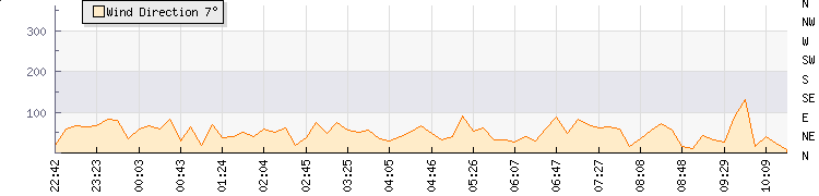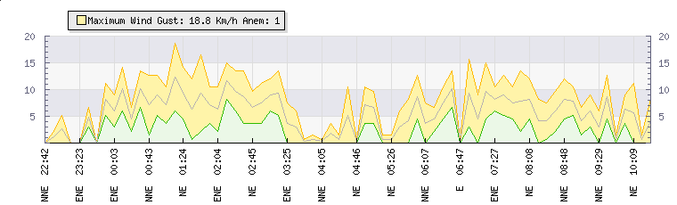 In the last few minutes the wind was North North East at an average speed of 8 kmh, reaching up to 11 kmh and a low of 5 kmh. The gust strength is6 kmh above the minimum speed |
