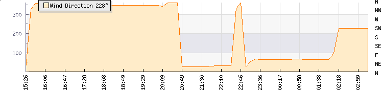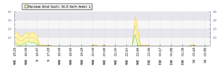 In the last few minutes the wind was North North East at an average speed of 0 kmh, reaching up to 0 kmh and a low of 0 kmh. The gust strength is0 kmh above the minimum speed |