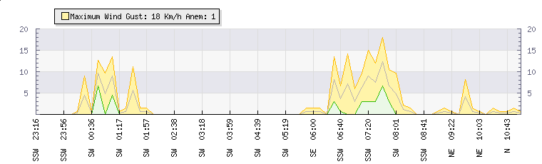 In the last few minutes the wind was North North East at an average speed of 1 kmh, reaching up to 2 kmh and a low of 0 kmh. The gust strength is2 kmh above the minimum speed |