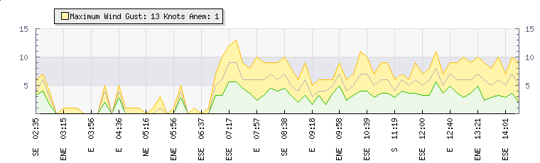 In the last few minutes the wind was East North East at an average speed of 5 knots, reaching up to 7 knots and a low of 4 knots. The gust strength is3 knots above the minimum speed |