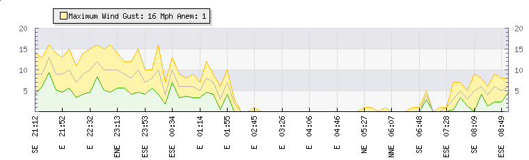 In the last few minutes the wind was East South East at an average speed of 10 mph, reaching up to 13 mph and a low of 7 mph. The gust strength is6 mph above the minimum speed |