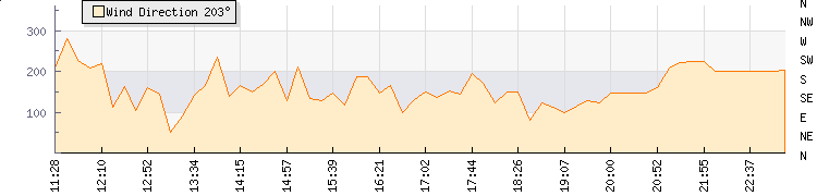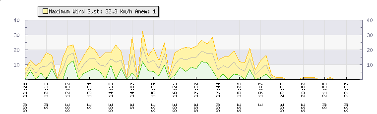 In the last few minutes the wind was South Westerly at an average speed of 0 kmh, reaching up to 0 kmh and a low of 0 kmh. The gust strength is0 kmh above the minimum speed |