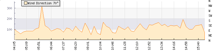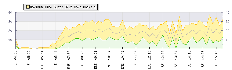 In the last few minutes the wind was Easterly at an average speed of 15 kmh, reaching up to 25 kmh and a low of 5 kmh. The gust strength is20 kmh above the minimum speed |